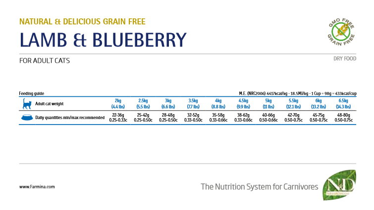Složení: Čerstvé vykostěné jehněčí (28%), sušené jehněčí maso (26%), brambory, živočišný tuk, sušená celá vejce, čerstvý herring, sušený herring, rybí olej, hydrolyzované živočišné bílkoviny, vláknina z hrášku, sušené mrkve, sušená vojtěška, inulin, fruktooligosacha­ridy, mannanoligosacha­ridy, prášek z borůvek (0,5%), sušený sladký pomeranč, sušená jablka, prášek z granátových jablek, prášek ze špenátu, psyllium (0,3%), prášek z černého rybízu, chlorid sodný, sušené pivovarské kvasnice, kořen kurkumy (0,2%), glukosamin, chondroitin sulfát, extrakt z afrikánu (zdroj luteinu).